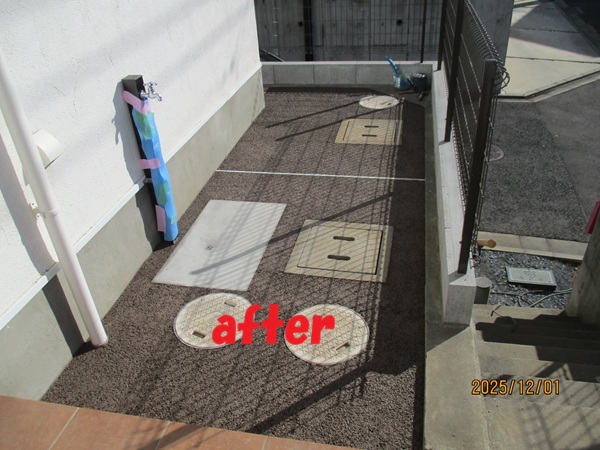 玄関前アプローチに固まる砂利を敷き詰めました。